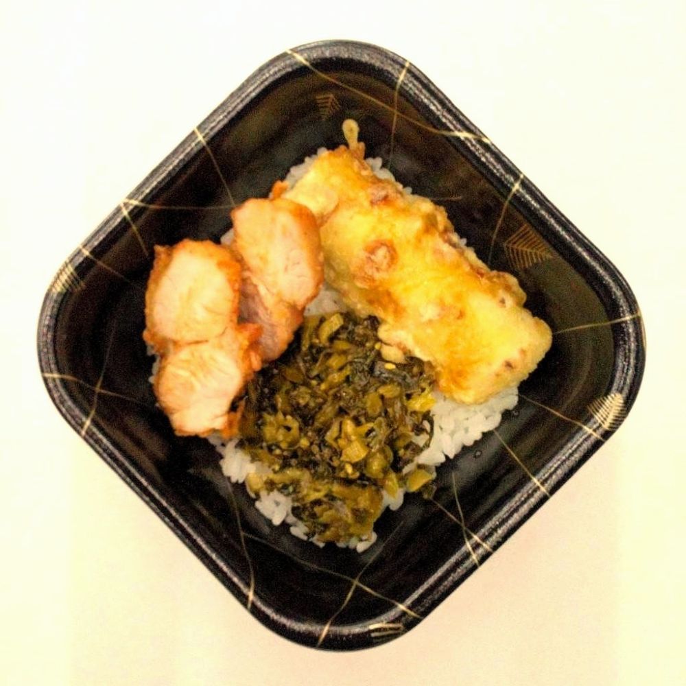 ごはん控え目、ほどよい満足感。高菜漬けにちくわ天ととりにく。