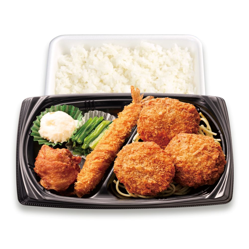 愛知県田原市産キャベツを使用した、春を感じる「メンチかつ」とエビフライ・唐揚げがセットになったお弁当です。