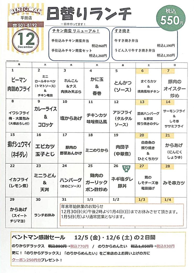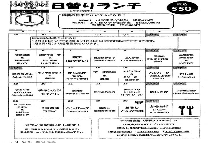平田店 日替り献立表
